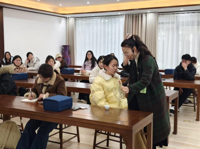 活动于14:30正式拉开帷幕,主持人致开场词后,社团骨干围绕活动主题展开开场引导,细致讲解了行茶十式的核心内涵与对应茶事礼仪,为后续教学做好充分铺垫。在核心的教学体验环节,主讲人以行茶十式为教学载体,逐式进行标准示范,同时对社员开展手把手指导,社员们分组进行实操练习,在一招一式的练习中掌握行茶标准流程,沉浸式感受茶技与茶礼的融合。活动最后,主讲人对本次茶技学习进行总结升华,将行茶技艺中的专注、严谨与茶道内涵深度结合,进一步引导社员体悟“习茶技、识茶事、悟茶理”的活动深意。